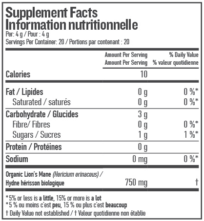 Organic lion’s mane, organic coconut water powder, organic black tea, organic lemon flavour, organic acacia gum, organic black tea flavour, citric acid, organic monk fruit extract.